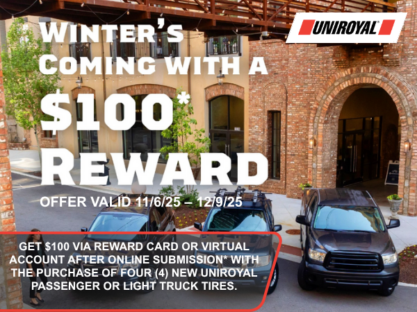 Get $100 via Reward Card or Virtual Account after online submission* with the purchase of four (4) new Uniroyal passenger or light truck tires.